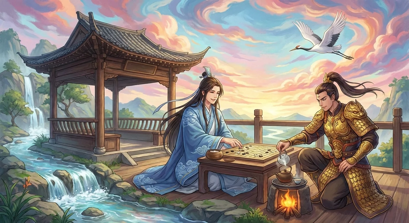 Anime style, two immortals playing chess in a small pavilion by a mountain stream, one immortal wearing a green Taoist robe embroidered with auspicious cloud patterns, one immortal wearing golden armor, tea being brewed by their side, the sky displaying colorful clouds, with whit…
