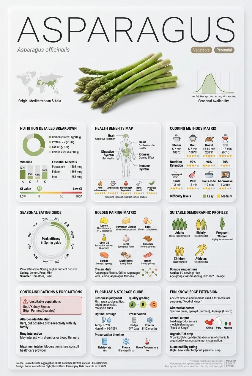 An encyclopedic information card in minimalist art style for [Asparagus], museum exhibition-grade design quality, information-rich but visually restrained
