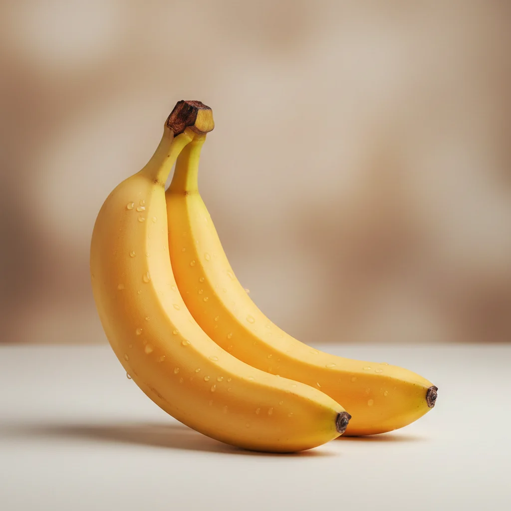 [PURPOSE] Generate 1 high-quality commercial-use image. No watermarks. No garbled text. [SUBJECT] Two ripe bananas standing together, positioned upright. [COMPOSITION] Studio shot; close-up; centered composition with the bananas as the main focal point, placed slightly apart to…