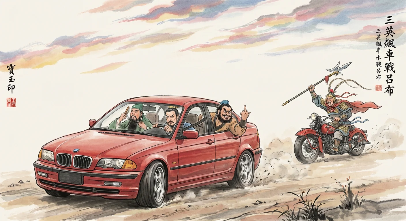 Draw a humorous ink wash illustration with a blend of ancient and modern elements, themed "The Three Heroes Racing Against Lu Bu": The scene is set at dusk, the sky is adorned with magnificent clouds, with large areas of white space to emphasize the artistic conception; Liu Bei (…