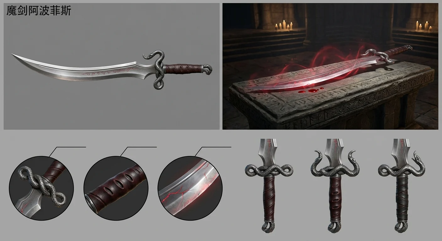[ASSET] A legendary weapon, a magnificent sword with a blood-fed design. The blade is sleek and curved, with subtle yet intricate engravings that symbolize dark power. The hilt features ornate detailing, with a twisted guard resembling serpentine forms, and a rich leather-wrapped…